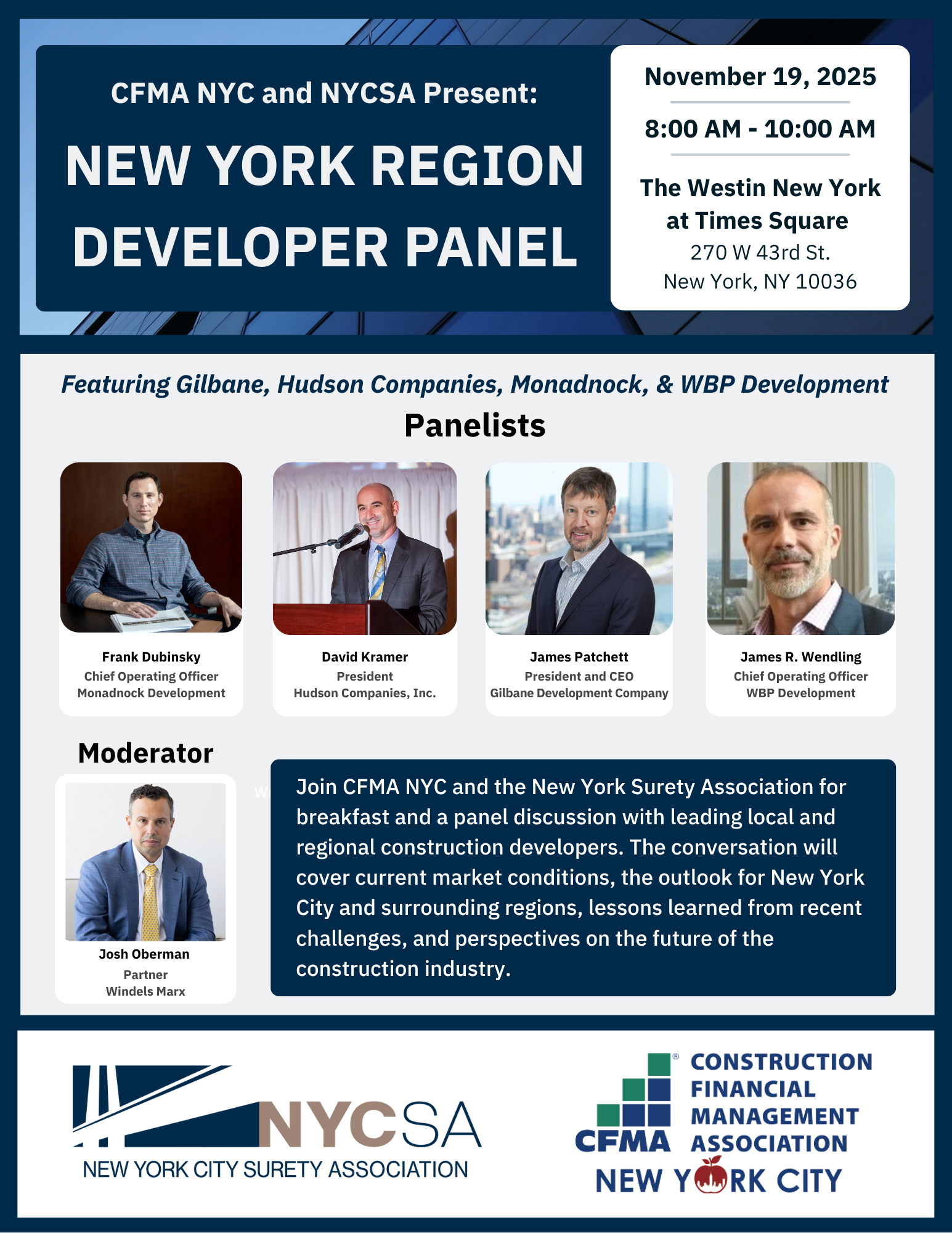 With the NYC mayoral election on the horizon, uncertainty around a new administration is shaping conversations across the industry. Join CFMA NYC and NYCSA for breakfast and a dynamic panel discussion featuring leading local and regional developers. Our panelists will share where New York’s construction market stands today, lessons learned from recent challenges, and what they expect for the city and surrounding regions in the months ahead.