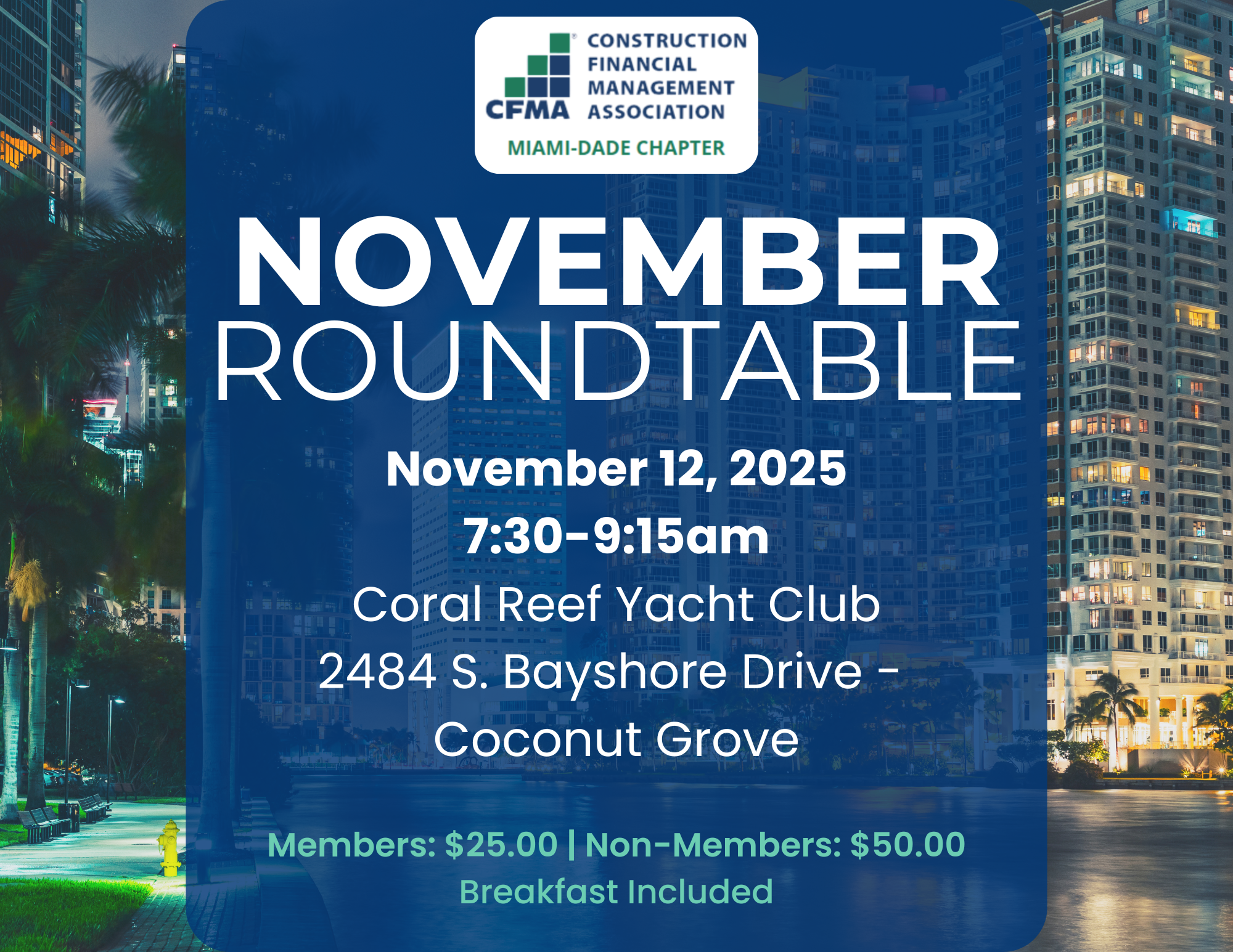 You're invited to connect, collaborate, and share insights with fellow construction financial professionals at our upcoming CFMA Miami-Dade Chapter Roundtable. This interactive event is a great opportunity to discuss industry trends, tackle common challenges, and exchange ideas in a relaxed, peer-driven setting.