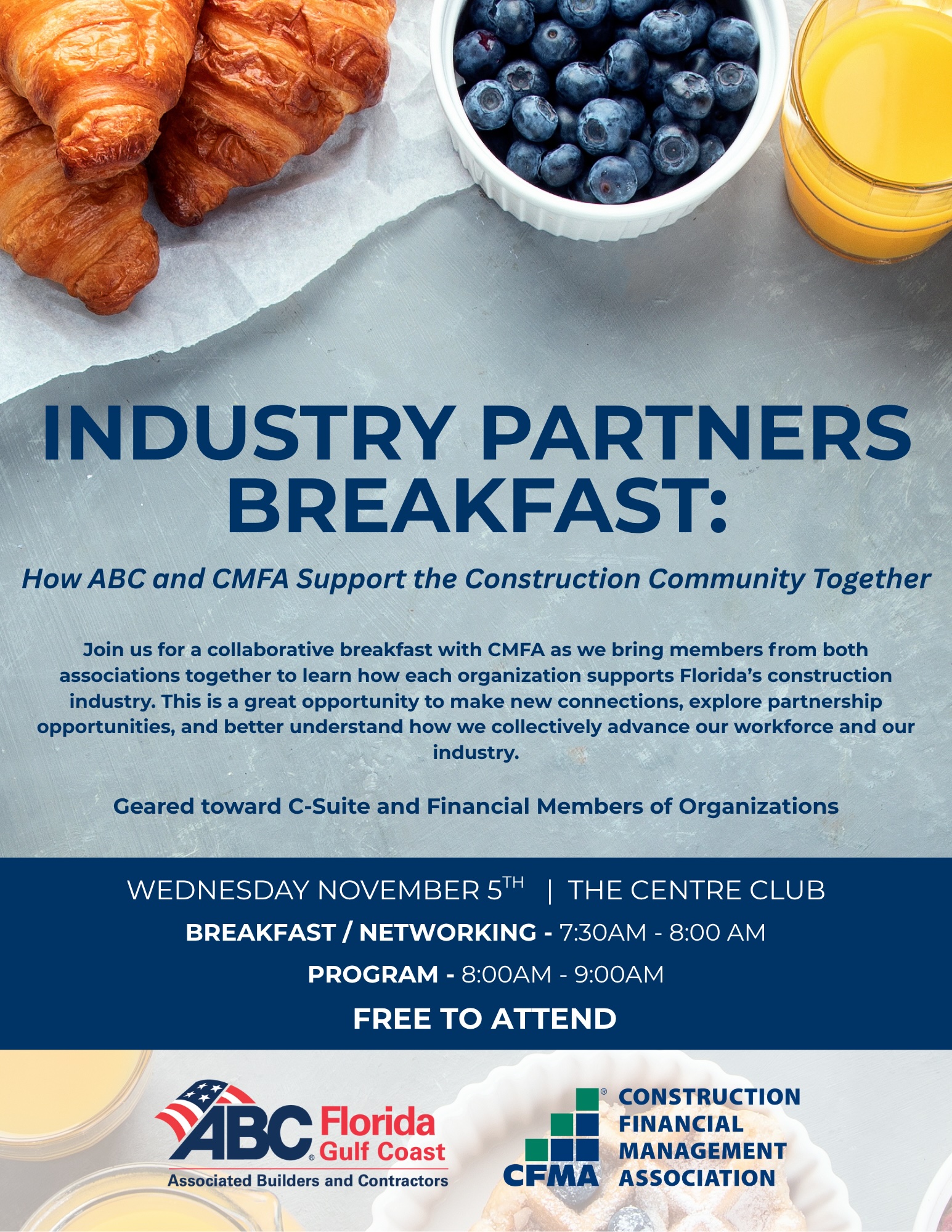 Join us for a collaborative breakfast with ABC Florida Gulf Coast as we bring members from both associations together to learn how each organization supports Florida's construction industry. This is a great opportunity to make new connections, explore partnership opportunities, and better understand how we collectively advance our workforce and our industry. This event is geared toward C-Suite and Financial Members of Organizations.